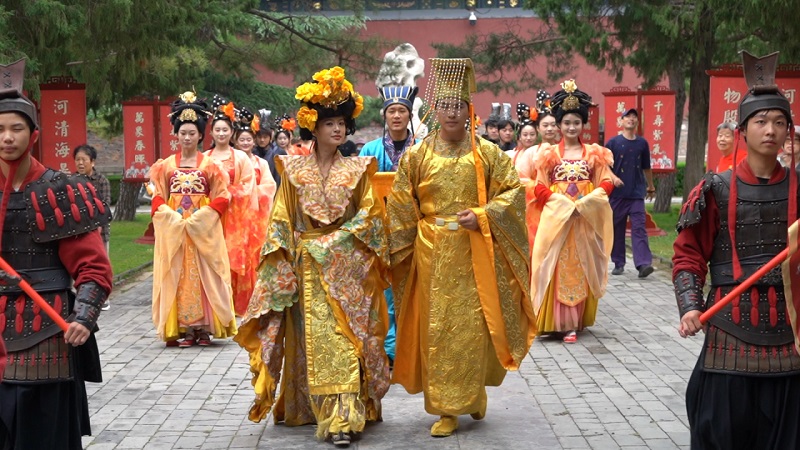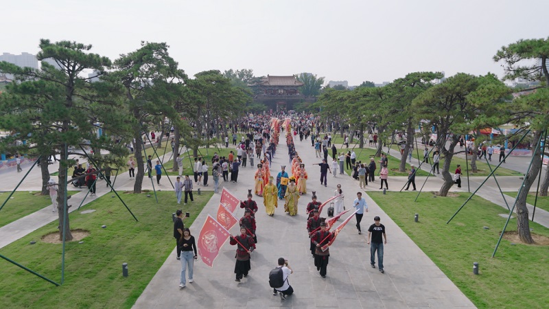 本次文化旅游節活動(dòng)自10月1日持續至10月5日,活動(dòng)期間設置了主題鮮明、層次豐富的特色內容。每日10時(shí),來(lái)自中華泰山·封禪大典的演藝團隊以《萬(wàn)國來(lái)朝·盛世啟市》主題演出拉開(kāi)序幕。天鼓初鳴之際,悠遠號角與鏗鏘鼓點(diǎn)交織共鳴,依次呈現開(kāi)場(chǎng)迎賓禮、司禮官肅穆登場(chǎng)、舞姬書(shū)生伴唐宮人物(李治、武則天)盛裝巡游。巡游結束后,演員們將化身隱藏NPC,身著(zhù)唐宮華服扮演“帝王”“貴妃”等角色,與游客展開(kāi)對詩(shī)猜謎、合影互動(dòng)等環(huán)節